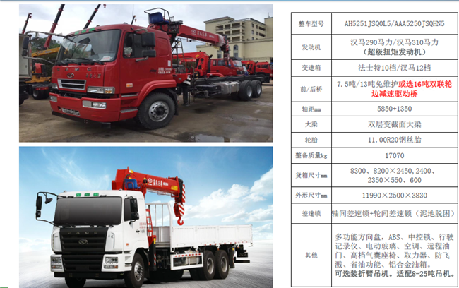 12噸14噸國六華菱后八輪隨車吊配置:H5251JSQ0L6,8400×2400×600,5850+1350,漢馬360馬力,華菱重卡平頂新內飾,法士特12檔,高強度變截面大梁,前橋7.5噸,后橋13噸,11.00R20鋼絲胎,電動門窗,中控鎖,斷氣剎,原廠空調,高檔豪華氣囊座椅,多功能方向盤,液晶顯示屏,節(jié)油開關。整備質量:17900kg。