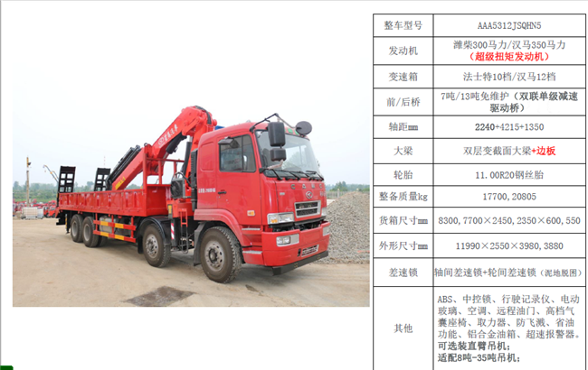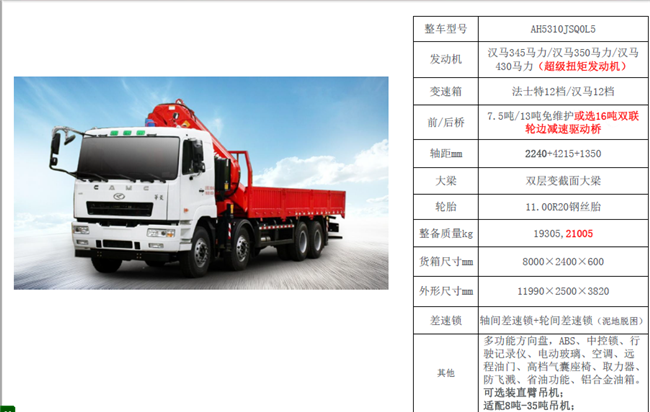 五軸重型起重機配置:AAA5530JQZHN6(10X4,五軸,國六),1850+3725+1375+1350,漢馬460馬力,電動門窗,中控鎖,斷氣剎,原廠空調(diào),高檔豪華氣囊座椅,多功能方向盤,液晶顯示屏,遙控鑰匙,節(jié)油開關(guān)�?傎|(zhì)量:53噸。底盤型號:HN5530A46C7M6J(可改平板運輸車、起重機),12.00R2020PR,前橋7.5噸,中間采用浮動橋,雙后橋16噸,士特12檔