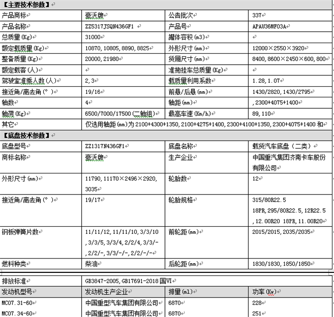 底盤型號:ZZ5317JSQN436GF1 額定質(zhì)量:10870